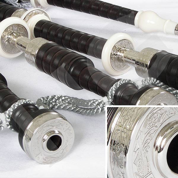 The McCallum AB4DT features Thistle engraving on the projecting mount plates, ferrules, slides, ring caps, mouthtube, and chanter sole.